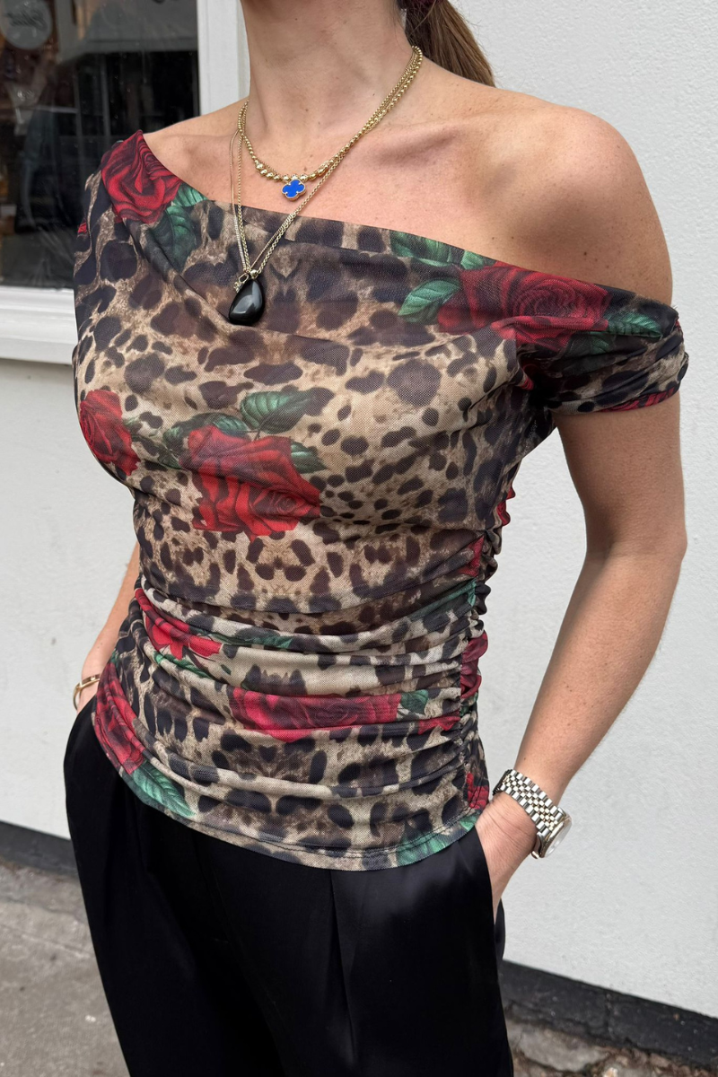 This eye-catching mesh top features a bold leopard print with rose detailing, creating the perfect blend of edgy and feminine. Designed with an off the shoulder look and a classic round neckline, it offers a flattering, breathable fit that transitions effortlessly from day to night. It comes with an inner boob tube lining. This style follows last year’s bestselling top now refreshed with a new, standout design.