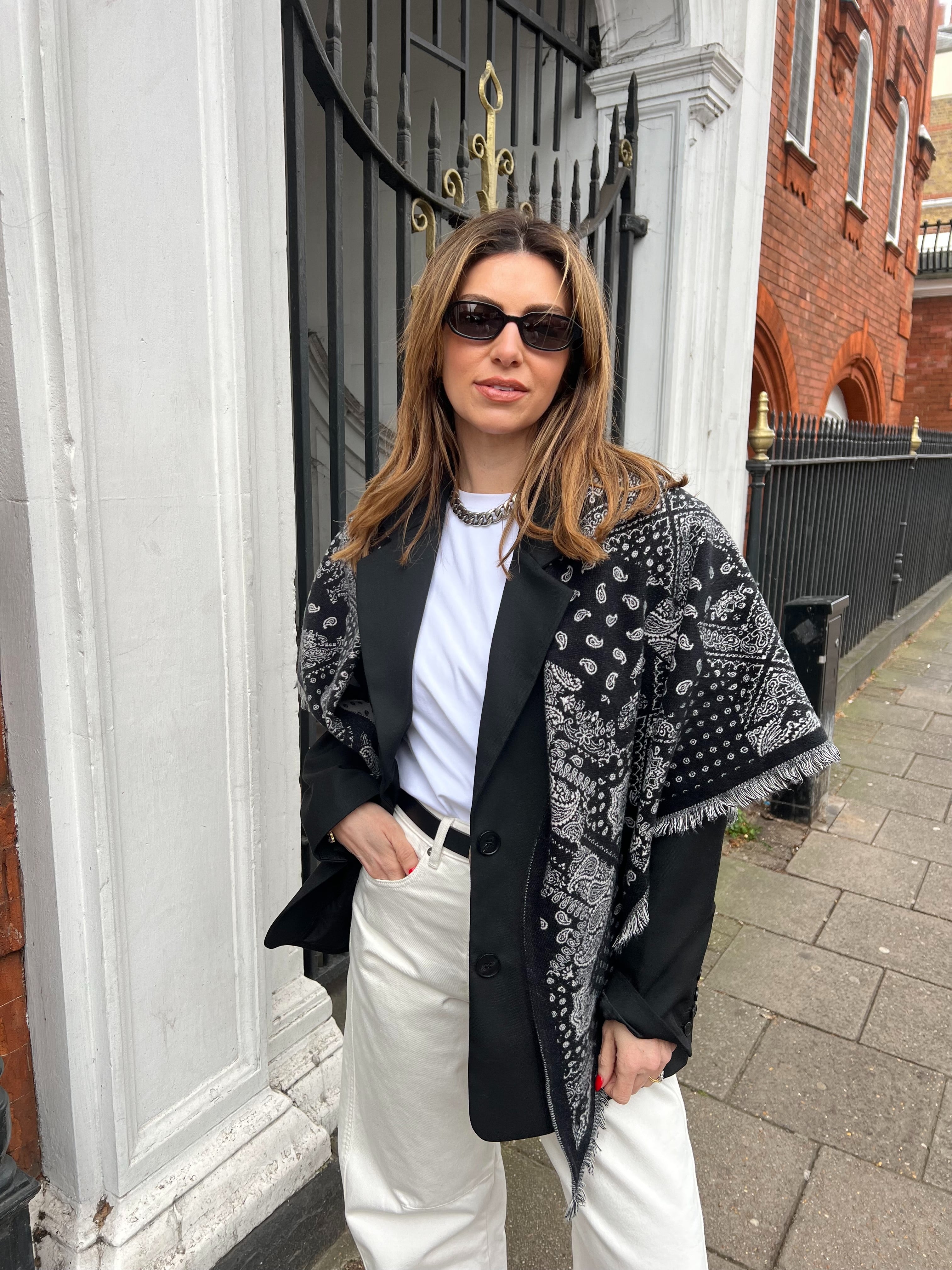Our best-selling large triangle scarf, now in black. Perfect for breezy spring days, this layering piece adds just the right amount of warmth while keeping your look fresh and breathable. Cut in a flattering triangle shape, it drapes naturally over the shoulders for an on-trend silhouette, while still allowing it to be tied neatly at the neck for a more stylish finish.