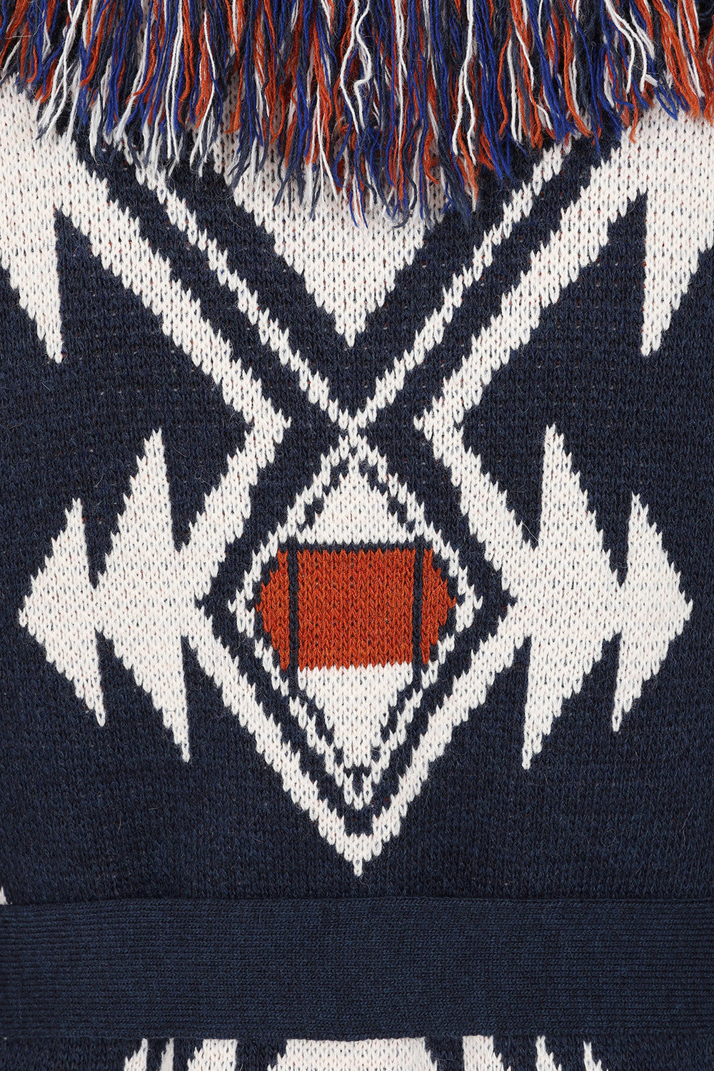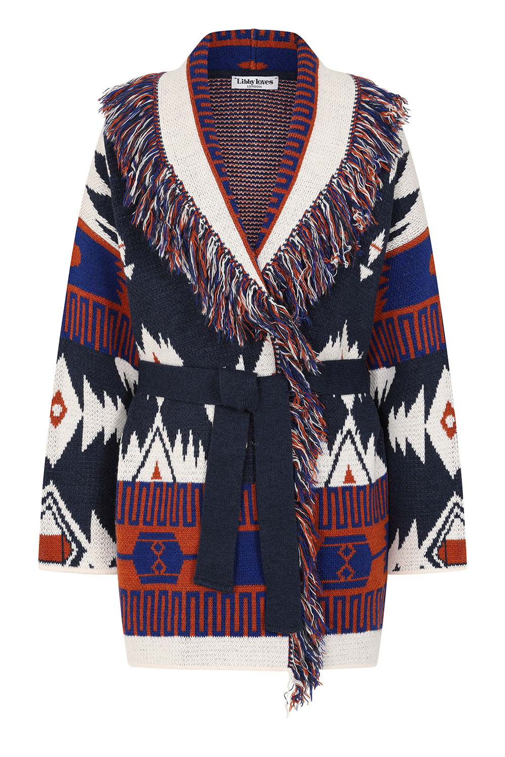 • Being stylish and warm in our oversized, Jacquard Astrid cardigan. It features a cozy chunky knit and a sophisticated fringed shawl collar, defined by a bold geometric pattern in earthy tones and cinched with a detachable self-tie belt.