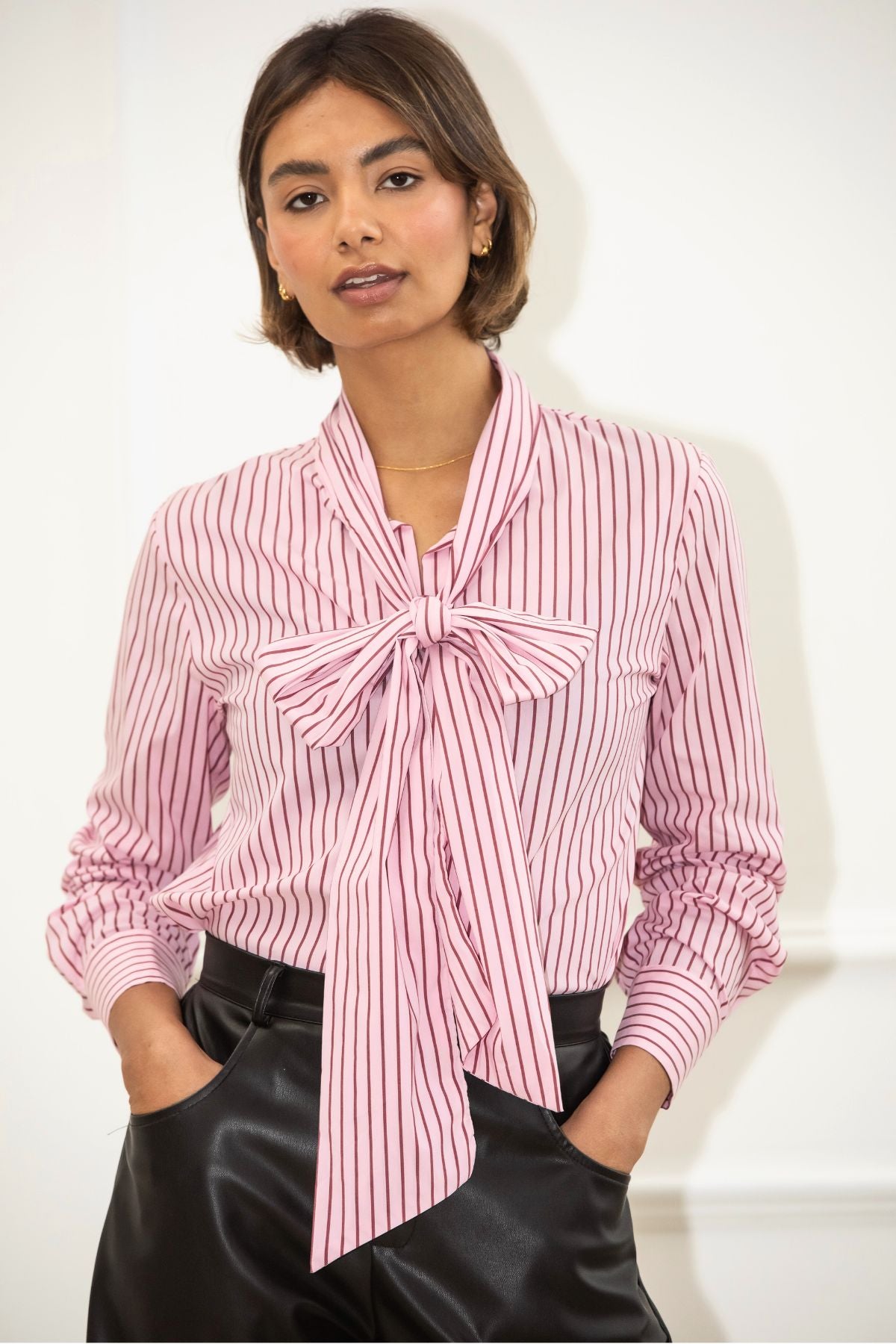 Sophisticated meets effortlessly cool in the Libby Loves Stripe Bow Shirt. Designed in a soft pink hue with refined vertical burgundy stripes, the shirt features a statement bow tie neckline that adds a polished, fashion-forward touch.