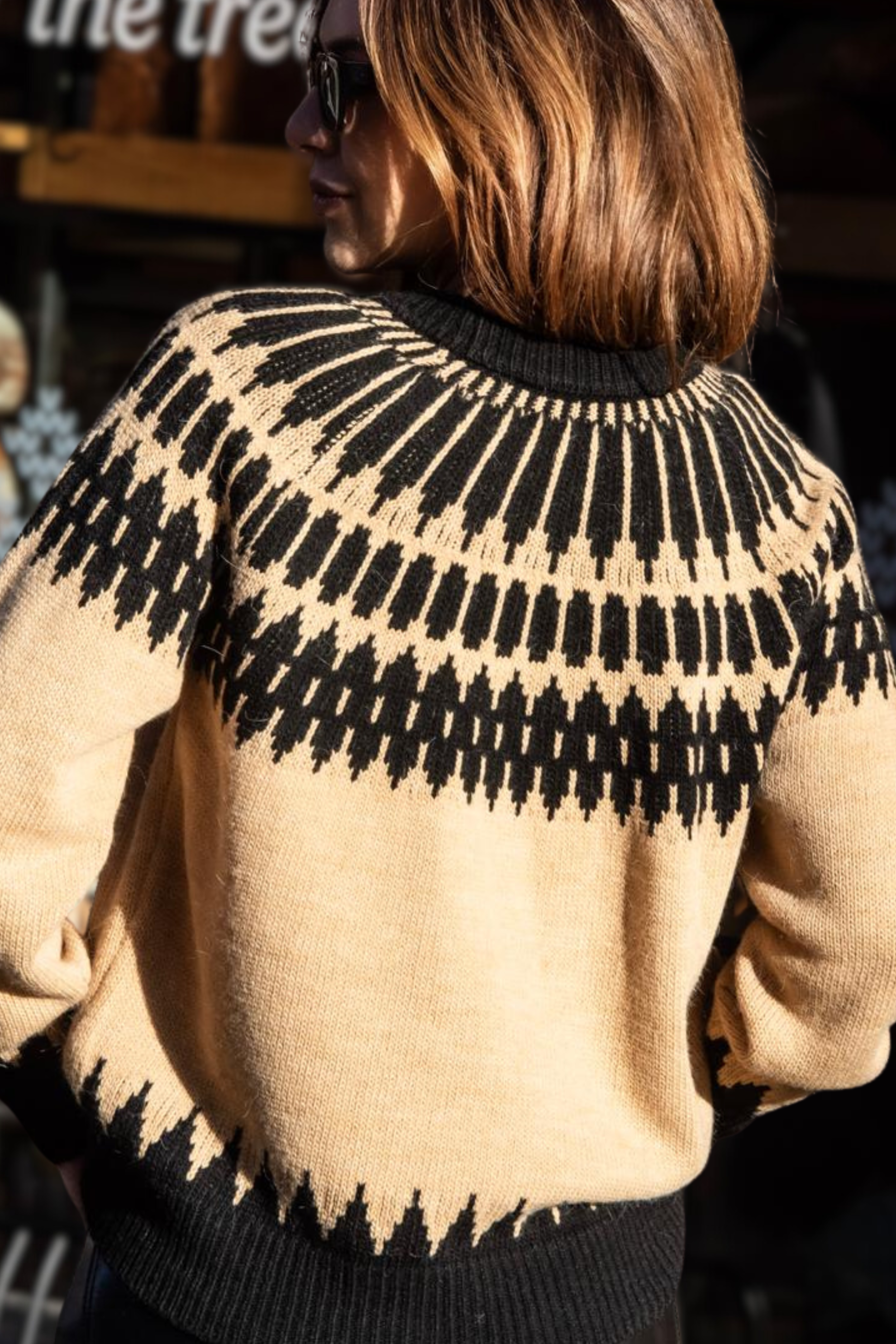 Part of the first drop of the Libby Loves Pre-Spring 26 collection, the Alpine Jumper is ideal for skiing this season. It showcases a bold, Fair Isle-inspired geometric pattern encircling the neckline. The hem and cuffs feature a saw-tooth colour block design that mirrors the yoke pattern. The fit makes it perfect for wearing over a collared shirt or under a winter coat with leggings and high boots.