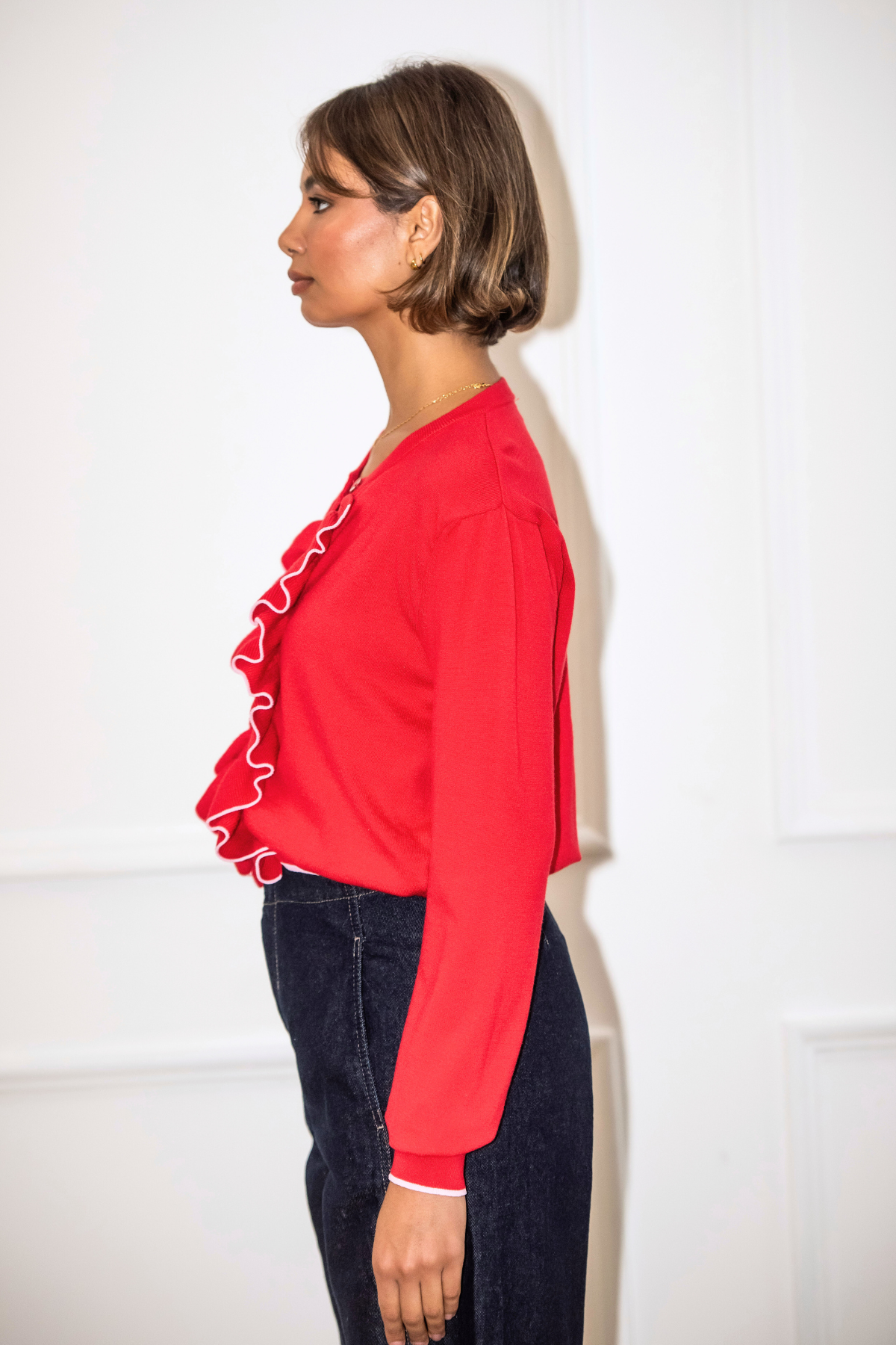 • The Gianna Frill Cardigan is the perfect addition to your festive wardrobe. Featuring delicate ruffle detailing along the front, this cardigan adds a touch of femininity to any outfit. Crafted from a soft viscose blend, it offers comfort and a flattering fit, making it an ideal choice for both casual and dressy occasions.