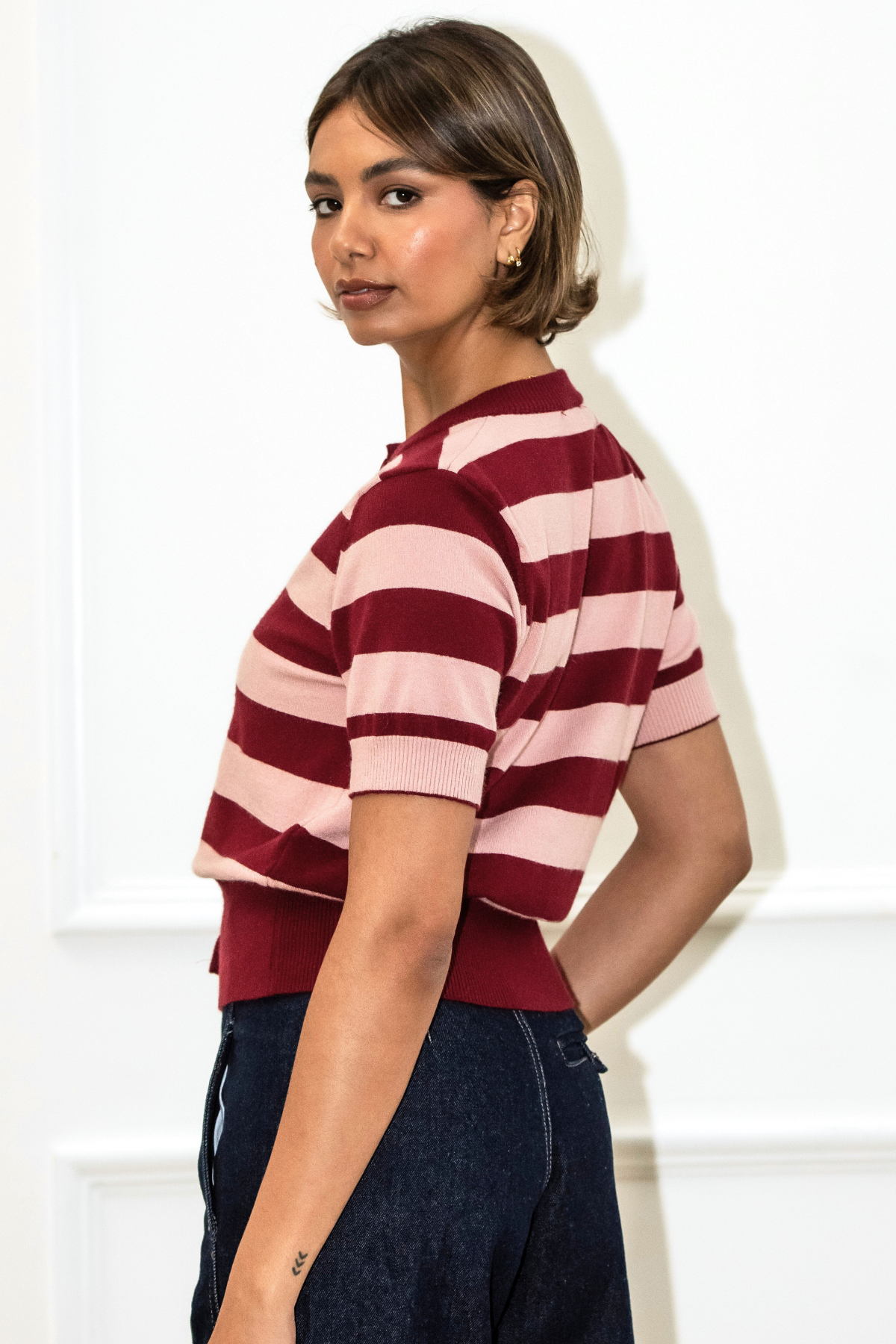 Make a statement with the Greta Stripe Cardigan, featuring a striking horizontal stripe pattern in burgundy and soft pink. Designed with a classic round neckline, short sleeves, and a button-front closure, this cardigan is a versatile layering piece that pairs with jackets, coats, or on its own.