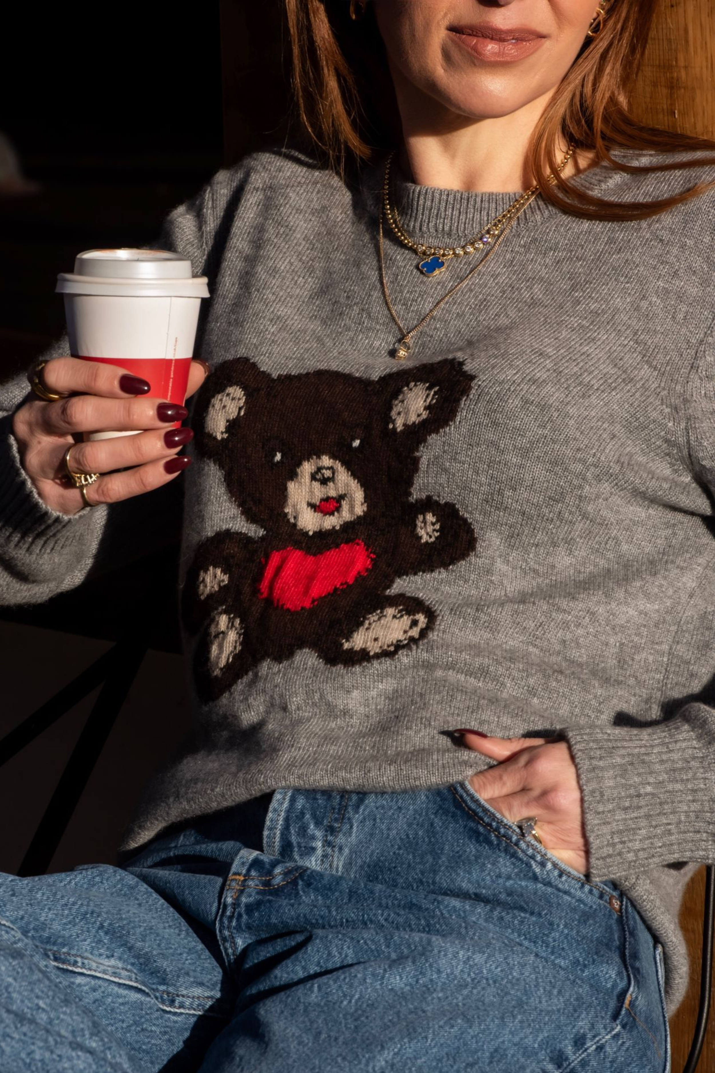 Fall in love with the Valentine Bear Jumper, a Valentine's special from the first drop of the Libby Loves Pre-Spring '26 collection. Featuring a playful dark teddy bear motif hugging a red heart, it adds a touch of fun to your knitwear rotation. The design is finished with a ribbed neckline and cuffs.