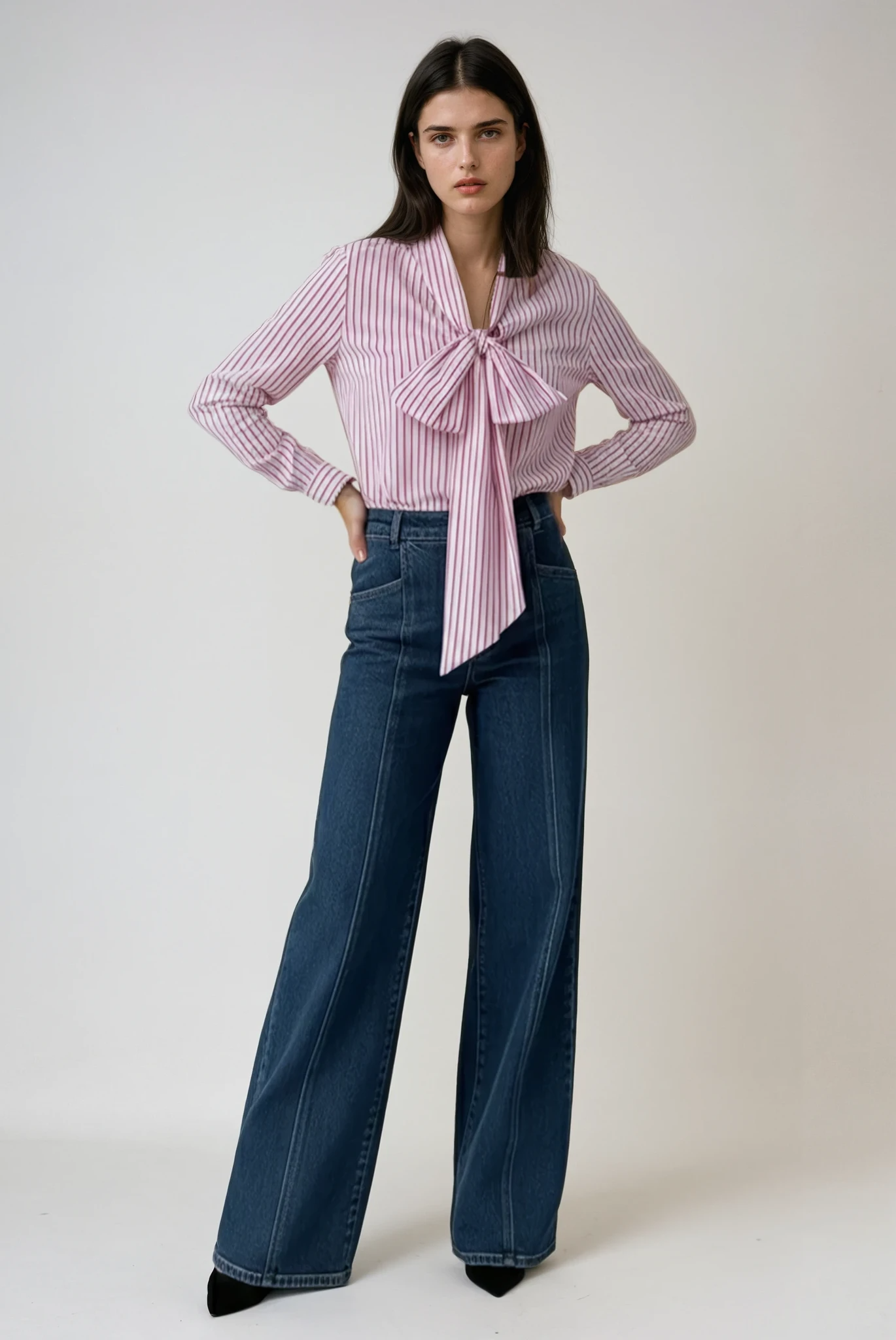 Sophisticated meets effortlessly cool in the Libby Loves Stripe Bow Shirt. Designed in a soft pink hue with refined vertical burgundy stripes, the shirt features a statement bow tie neckline that adds a polished, fashion-forward touch.